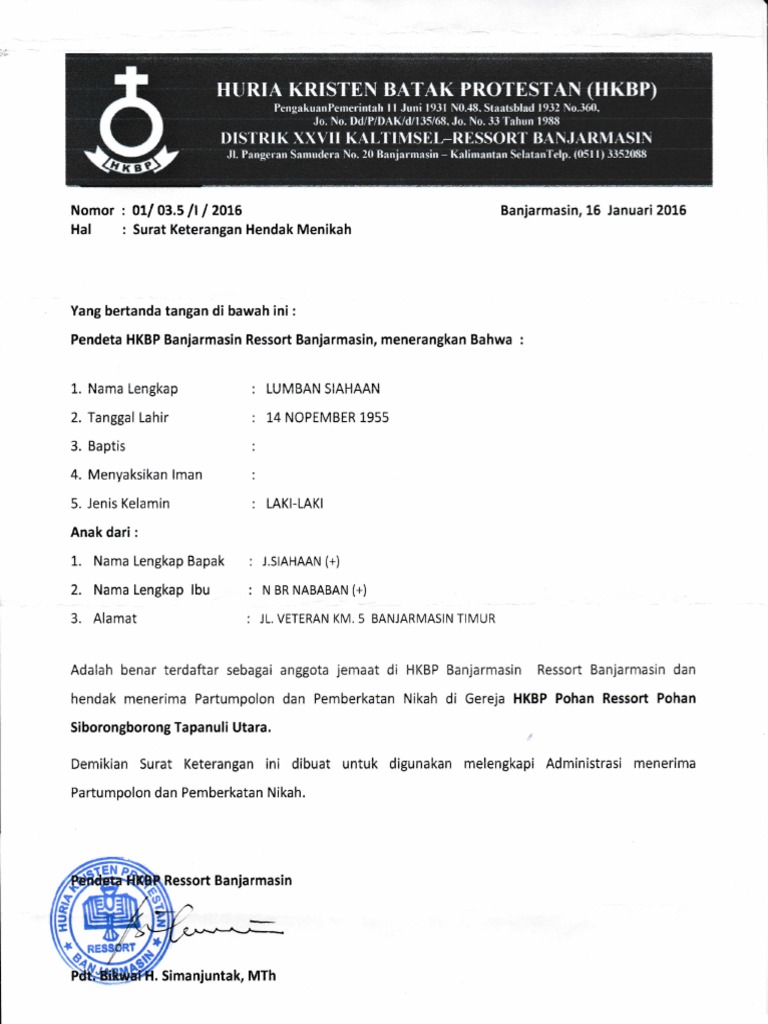 Surat baptis asli yang telah diperbaharui ; Jika pemberkatan nikah dilaksanakan di hkbp / gereja lain maka seharusnya telah diberikan salinan / ketikan perjanjian nikah untuk pemberitahuan ke gereja diminta kepada sekretariat gereja surat keterangan jemaat untuk melengkapi persyaratan perjanjian nikah dan biasanya dilampirkan fotocopy akte sidi. Unsur unsur desain itu antara lain meliputi gambar objek ornament serta teks redaksi baik kata kata maupun ayat ayat alkitab yang digunakan untuk undangan pernikahan kristen. Nikah siri menurut agama kristen. Surat keterangan belum pernah menikah dari keluarga dan pemerintah.